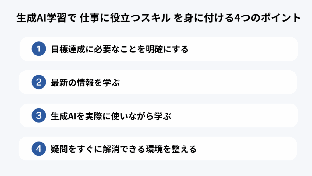ここでは、生成AIを業務に取り入れたい方に向けて、学習効果を最大化するための4つのポイントを紹介します。