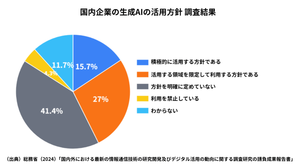生成AIが普及してまだ数年ですが、すでに多くの企業で導入が進んでいます。総務省の発表によると、調査対象の企業の中で生成AIを「積極的に活用する」「活用する領域を限定して利用する」と回答した企業は、合わせて42.7%にのぼりました。