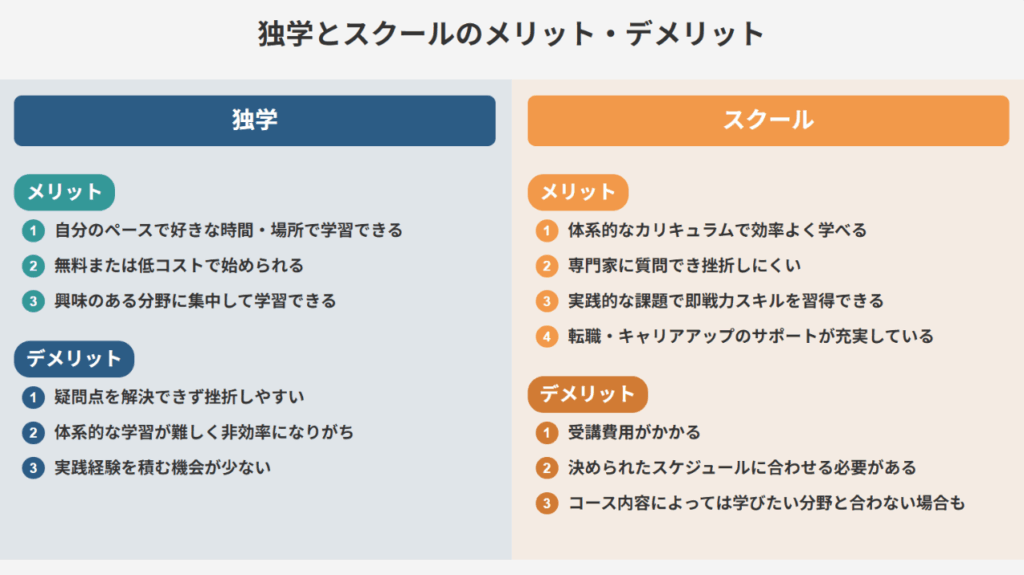生成AIの学習方法は、「独学型」と「スクール型」に大きく分けられます。自分に合った方法を選ぶには、それぞれの特徴を知っておくことが大切です。