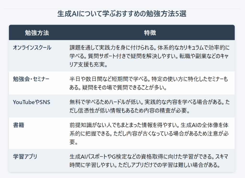 ここでは、生成AIの学習方法を5つ紹介します。それぞれの学習方法にはメリット・デメリットがあるので、それらを理解し、自分に合った勉強方法を選ぶことが大切です。