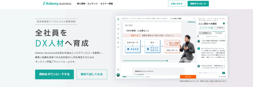 ![]() 株式会社アイデミー | https://business.aidemy.net/ | 基本はオンライン(講師の派遣も可能) | ・大手企業の導入実績 ・学習サポートLLMによる補助 | ダイキン工業株式会社、ヒューベルサービス株式会社 | あり |