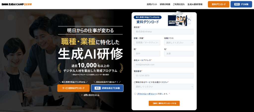 実務に直結したスキルを短期間で習得し、社内のAI活用を本格化させたい企業に最適なのが「DMM 生成AI CAMP DX研修」です。この研修では営業・人事・マーケティングなど、各職種に合わせたカスタマイズが可能で、現場ですぐに使えるスキルの習得を重視しています。