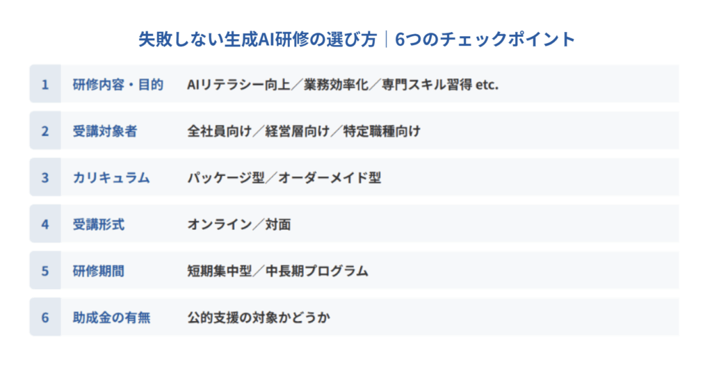 生成AI研修と一口にいっても、その内容や対象者、実施形式はさまざまです。目的に合わない研修を選んでしまうと、期待した効果が得られないこともあります。ここでは、研修選びで失敗しないために確認すべき6つのチェックポイントを紹介します。