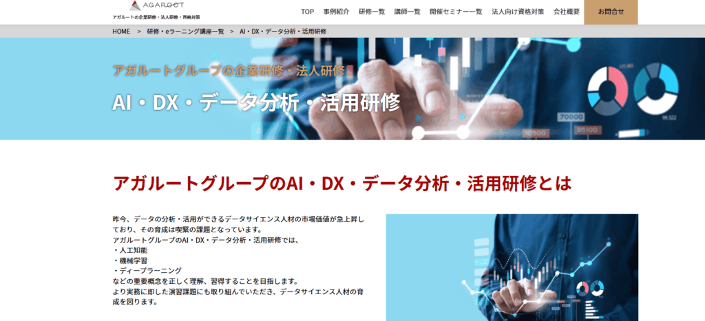 アガルートの法人研修は、G検定やDS検定(データサイエンティスト検定)に加えて、生成AIやPythonなどの最新トピックを網羅した実践的な内容です。同社の研修は、企業の業務効率化やDX推進を支援することを目的としています。