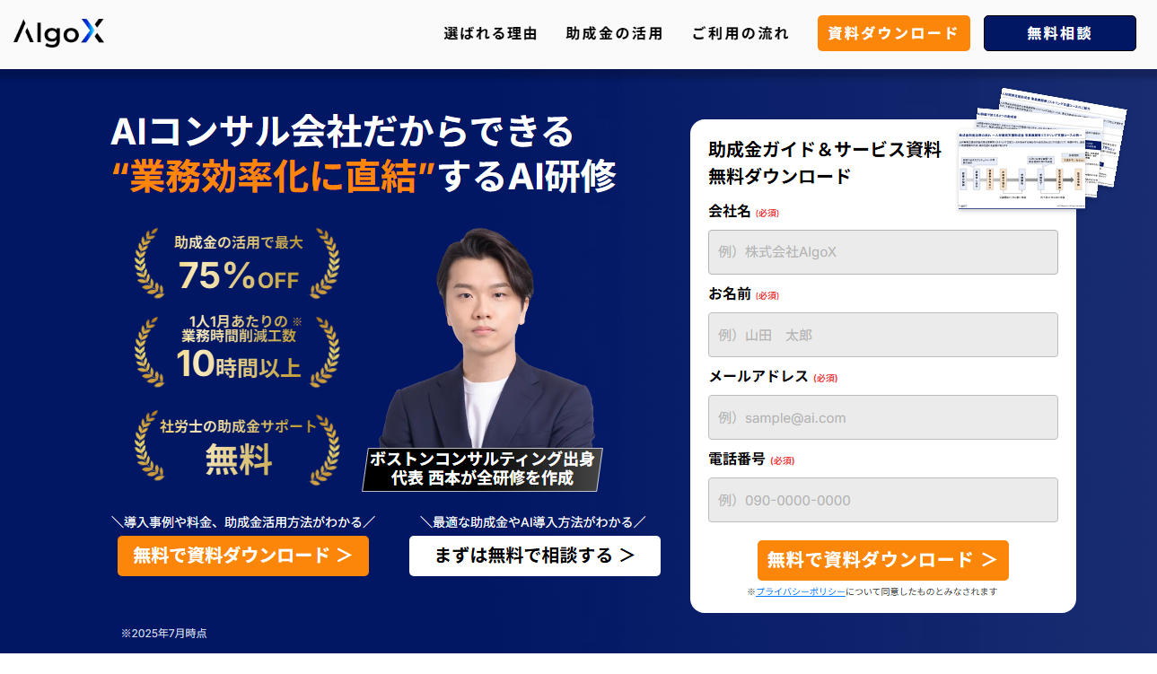 株式会社AlgoXは、業務効率化を目的とした生成AI研修を提供するコンサルティング企業です。研修内容は実務への落とし込みに重点を置いており、参加者のレベルに応じてツールの基本操作から応用まで幅広く対応しています。
