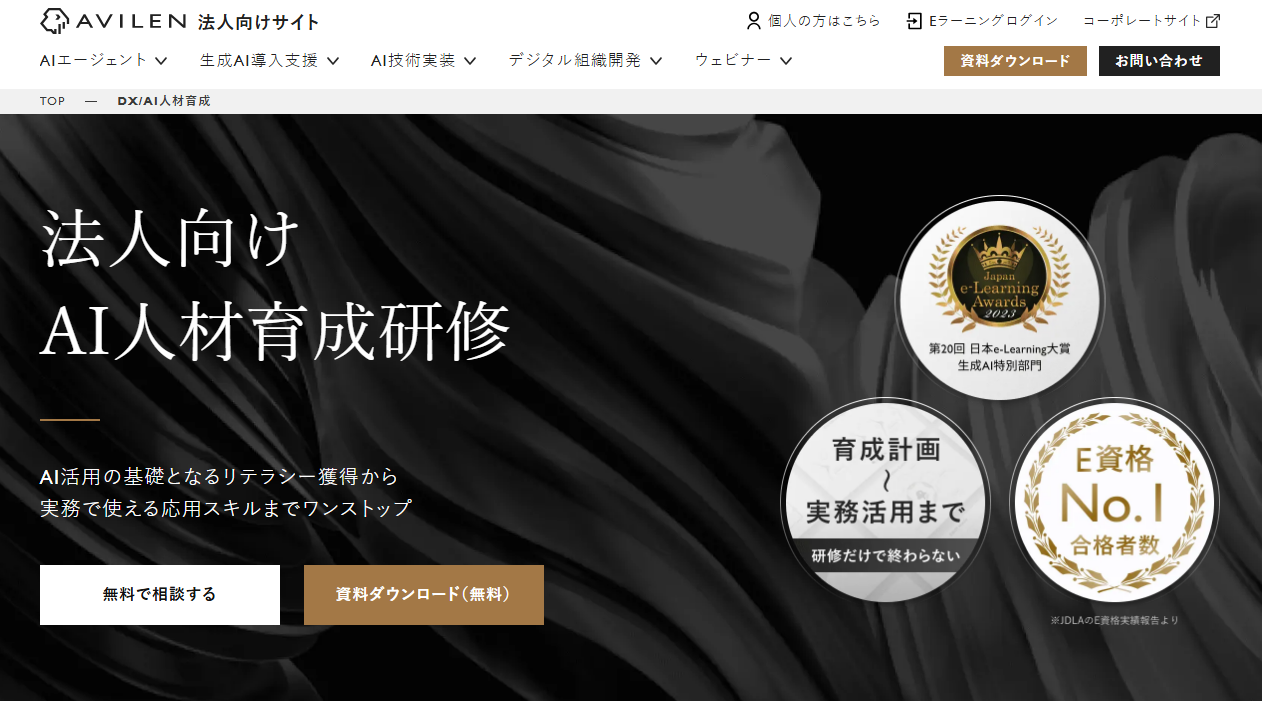 株式会社AVILENは、AI活用を推進する企業向けに、リテラシー教育からAI実装支援まで幅広い研修サービスを提供しています。全社員向けの基礎研修から、ビジネス層・エンジニア層それぞれに適した専門カリキュラムまで用意されており、課題や人材レベルに応じて柔軟に設計可能です。