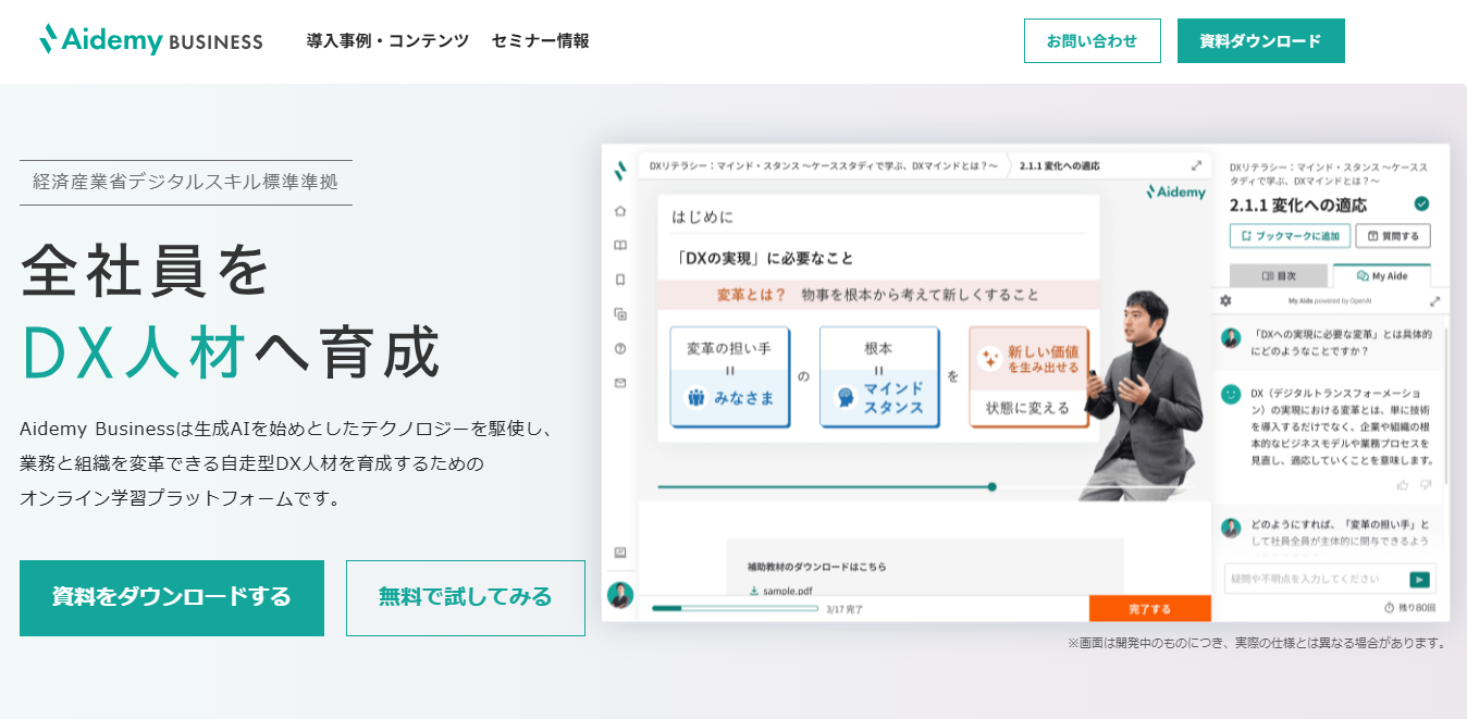 ![]() 株式会社アイデミー | https://business.aidemy.net/ | 基本はオンライン(講師の派遣も可能) | ・大手企業の導入実績 ・学習サポートLLMによる補助 | ダイキン工業株式会社、ヒューベルサービス株式会社 | あり |