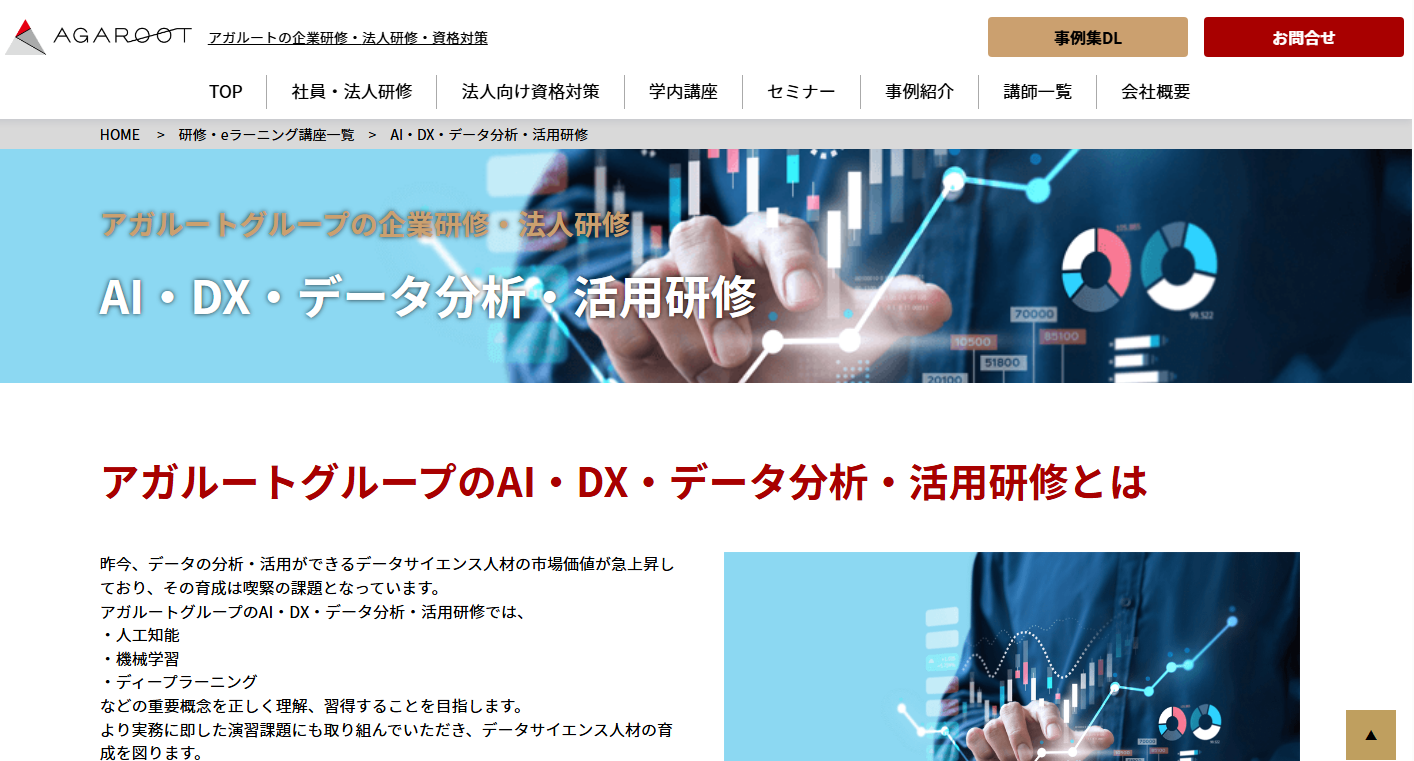![]() 株式会社アガルート | https://www.agaroot.jp/corporation/menu/data/ | オンライン/対面 | ・テーマ別に柔軟対応 ・実務経験豊富な講師陣 ・資格対策にも対応 | – | – |
